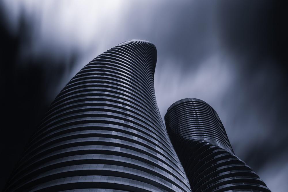 Your photo is excellent - the point of view really shows the strange, futuristic shapes, gives a sense of great height, and has the fashionable blurred clouds too. I like the monochrome tones with the slight blue effect. The slight 'shininess' of the towers makes them look metallic and cold. Good work!