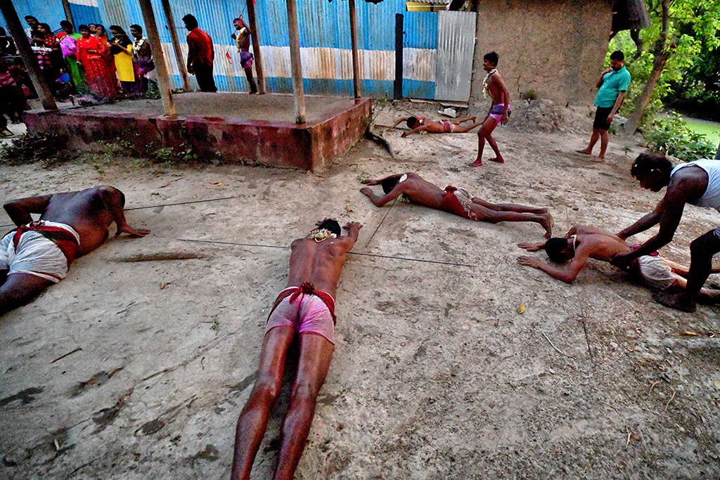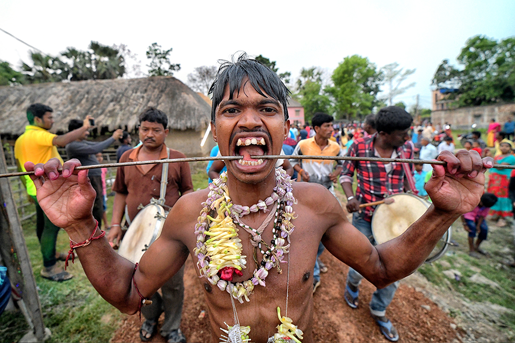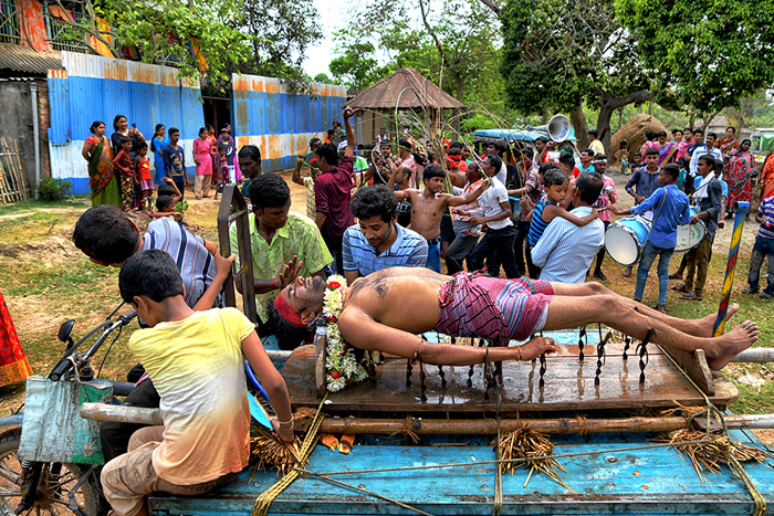 This photo story has been made during the celebration of the Gajan festival in a remote village of Hooghly district of West Bengal. The unique features of this celebration is that here villagers pierce iron rod in their body, tongue and crucify themselves by laying down on wooden framework with huge nails fixed on it.