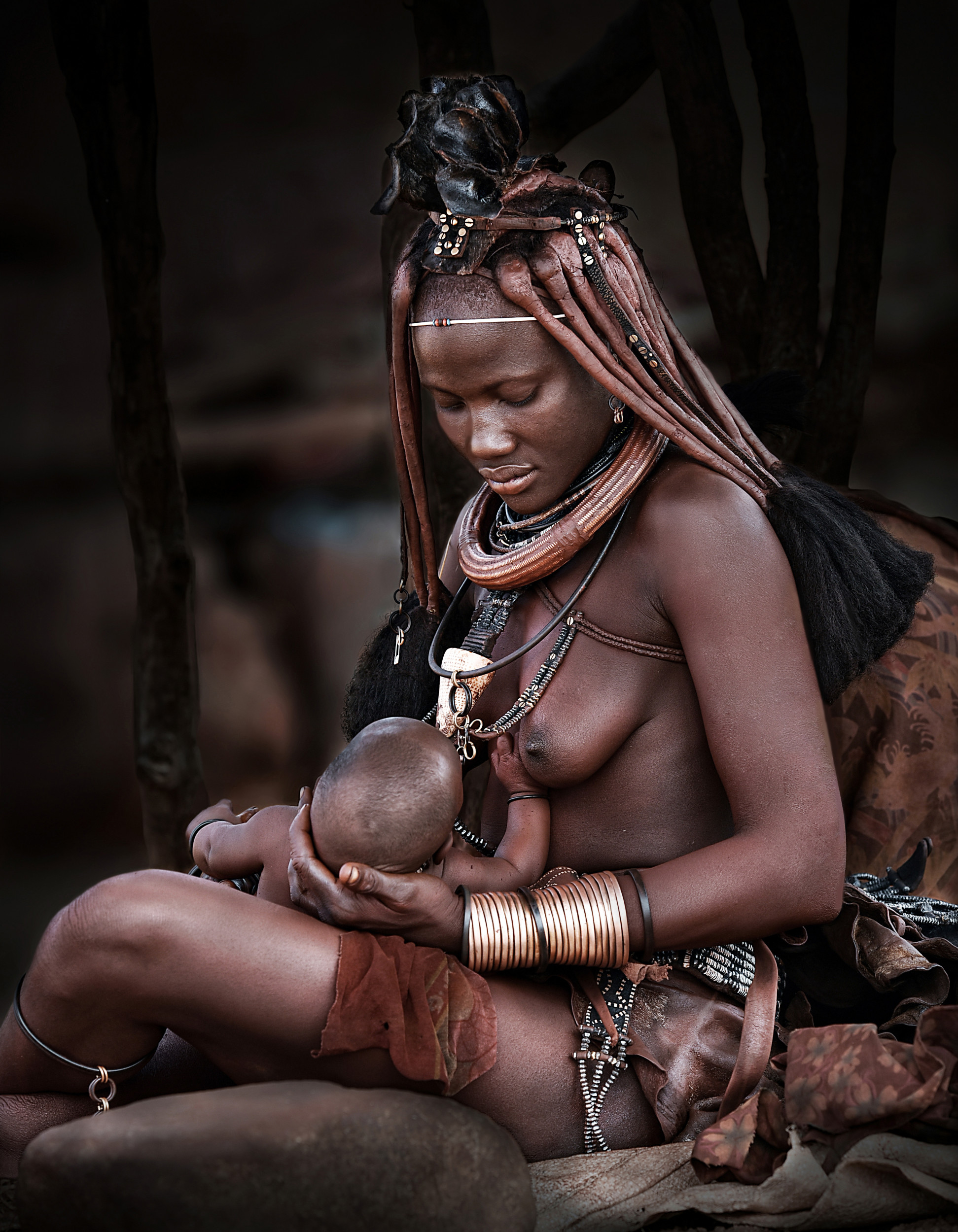 The Himba Tribes are located on the border between Namibia and Angola! Two days of arduous travel to reach those places. We brought them food and they welcomed us very warmly. Learning a few words in their language allowed us, even if is was a very little, to interact with them. It was lunchtime and they were preparing food. The woman I photographed had just finished giving a bottle of milk to her little one and was looking at him very tenderly! It was a beautiful scene.  I couldn't resist to photograph it.